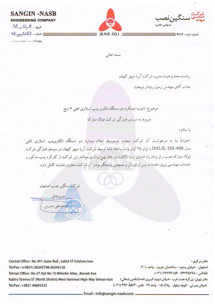 شرکت سنگین نصب اصفهان طی نامه ای رضایت خود از عملکرد 2 دستگاه از پمپهای سانتریفیوژ اسلاری این شرکت که در واحد غبارگیری شرکت فولاد مبارکه نصب و راه اندازی شده است را اعلام نموده و از نحوه و کیفیت ارائه خدمات پس از فروش اظهار خرسندی نموده است.